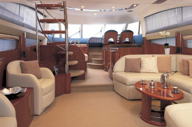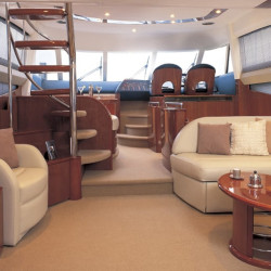 Guests can enjoy various outdoor areas for socializing or sunbathing. The flybridge provides sofa seating with panoramic views, while the bow features a large sun pad perfect for relaxing. Additionally, the covered teak aft deck is ideal for conversation or dining outdoors.