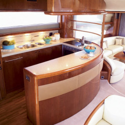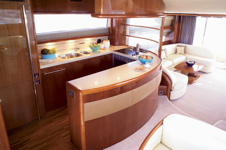 The salon features elegant teak finishes, an L-shaped sofa, and a cocktail table. Guests can dine at the high-gloss teak table while enjoying freshly prepared meals in the full galley. The galley includes a dishwasher, ice maker, and freezer, making onboard dining effortless.