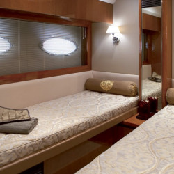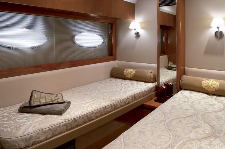 This yacht sleeps six guests across three staterooms. Each stateroom has a private head, providing privacy and convenience. The master cabin offers a luxurious retreat, while the twin bed cabin accommodates families or friends traveling together.