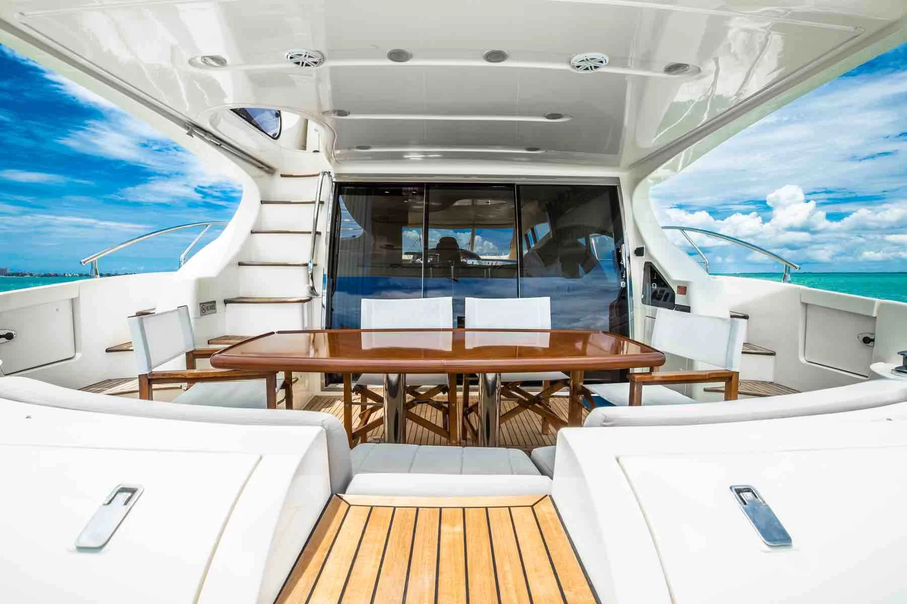 - Expansive flybridge with jacuzzi and sunpads for soaking in the sun