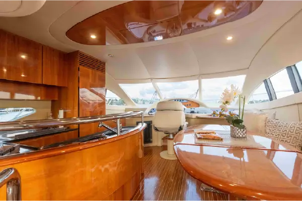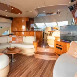 Inside, the yacht features a bright, contemporary salon filled with natural light. Comfortable seating and elegant finishes create a welcoming space for relaxation or social gatherings. This design ensures guests enjoy both style and comfort during their cruise.