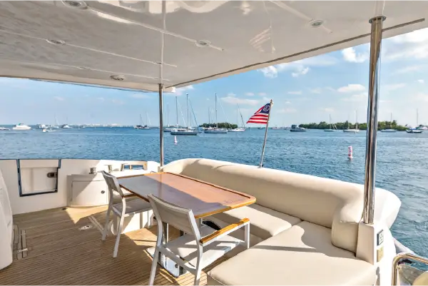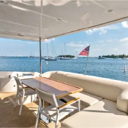 The flybridge offers ample seating, a wet bar, and panoramic views of Miami’s coastline. Guests can relax, socialize, and enjoy the scenery while cruising. The open layout ensures effortless movement and seamless interaction among guests.