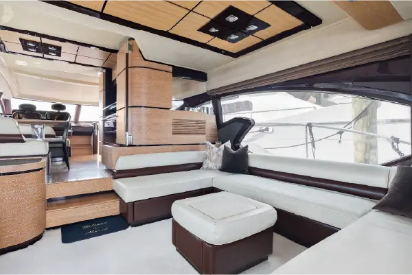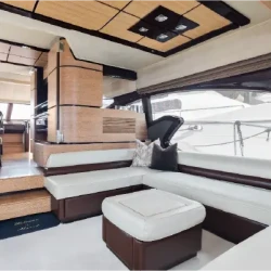Inside, the yacht features a modern salon with sleek furnishings and plenty of natural light. This space provides a comfortable environment for relaxation or enjoying onboard entertainment. The airy design enhances the feeling of luxury during the charter.
