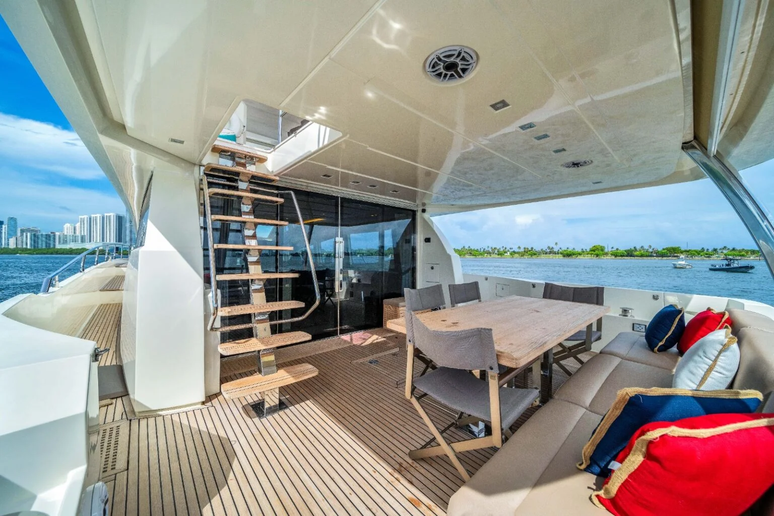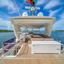 To elevate the experience, this 75ft Prestige yacht includes a jetski and water toys that bring energy and fun to every charter. Guests can easily transition between cruising and water activities, creating a balanced mix of relaxation and adventure. In addition, the swim platform allows safe and effortless access to the water throughout the day.