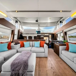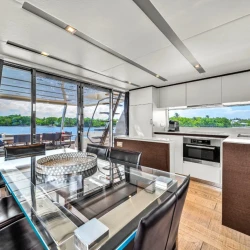 Inside, the salon features contemporary finishes, large windows, and a bright open layout. Natural light fills the space, which enhances the overall feeling of openness and luxury. Additionally, the seamless connection between the salon, dining area, and galley allows guests to relax indoors while remaining engaged with the group. Consequently, the interior works well for both entertainment and downtime.
