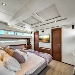 Below deck, the yacht includes four well designed cabins that offer privacy and comfort for extended charters. Each cabin provides comfortable bedding, storage space, and a calm environment for rest. Furthermore, three full bathrooms ensure convenience for all guests onboard, even during longer experiences on the water.
