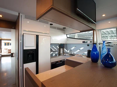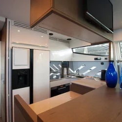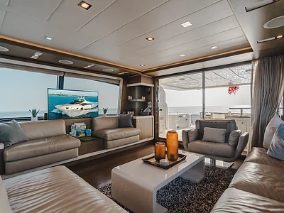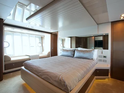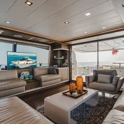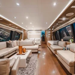 This yacht features four beautifully designed cabins and three bathrooms, accommodating up to 13 guests. The salon provides panoramic views and a seamless layout for lounging, dining, and entertainment. Natural light fills the space, creating a bright and welcoming atmosphere.