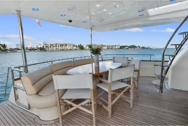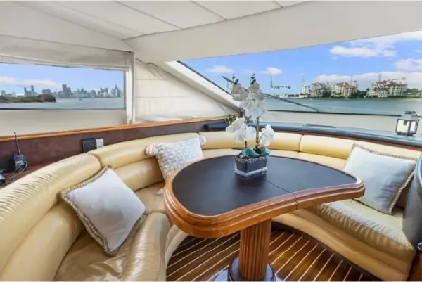 The flybridge features a relaxing jacuzzi and generous seating areas. It offers panoramic views of Miami Beach and Biscayne Bay. As a result, guests can unwind while enjoying ocean breezes and unforgettable scenery.