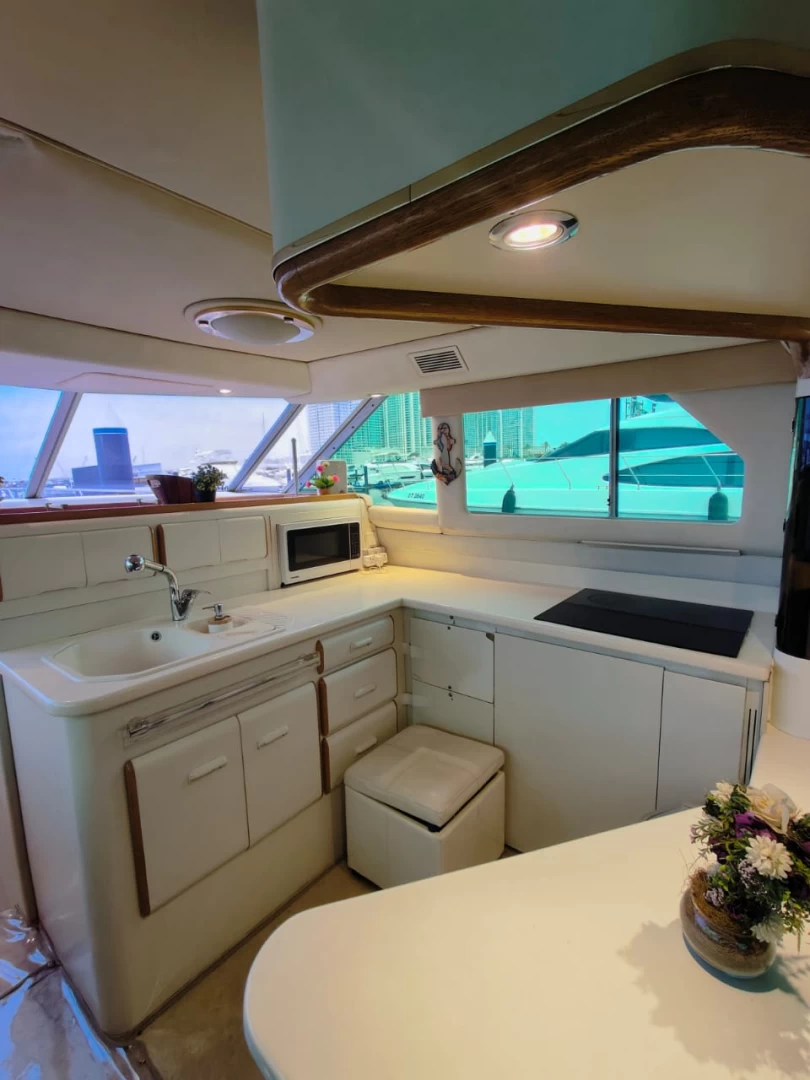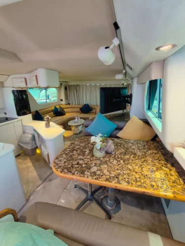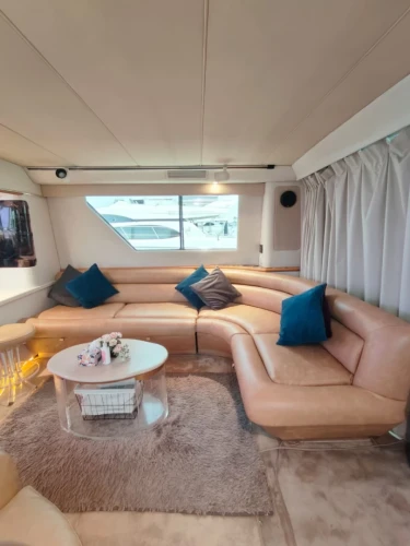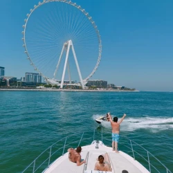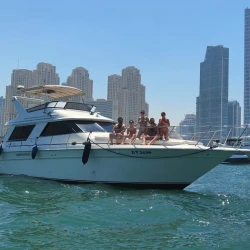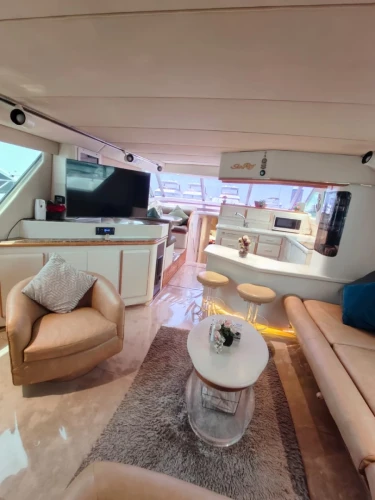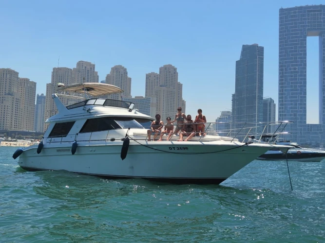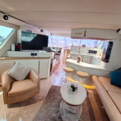 Luxury Princess 60 Fly Yacht in Dubai Marina, a 2022 model measuring 60 feet and powered by 1,800 horsepower. The yacht is rented with a captain and includes amenities for leisure activities such as wakeboarding, fishing, snorkeling, stand-up paddleboarding, and television entertainment. Special services like balloon decorations, party setups, refreshments, and a free one-hour Jet Ski ride are also offered. It is designed for events such as birthdays, anniversaries, and graduations, accommodating up to 22 guests , with fuel included and no security deposit required. Book now at supremeyachtcharters.com